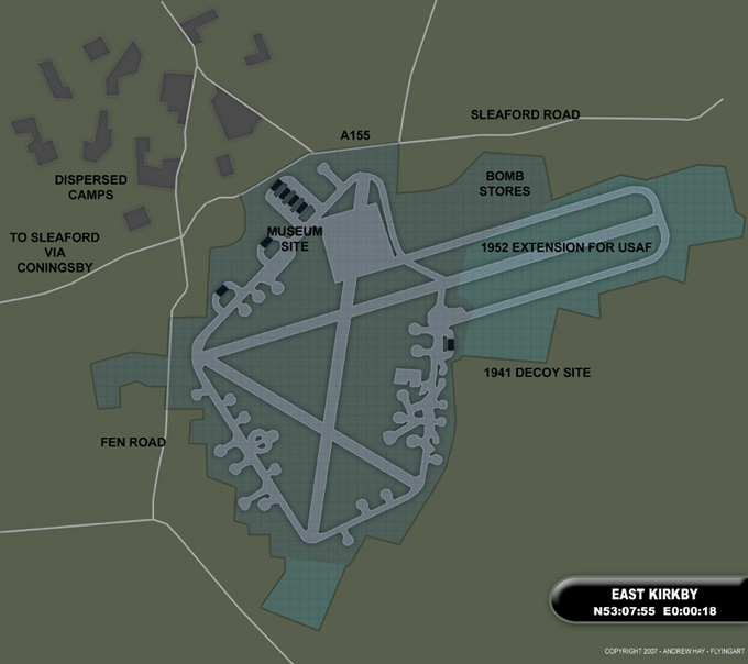East Kirkby originally functioned as a decoy airfield and its wooden Whitley bombers were targeted on several occasions by the Luftwaffe, however construction of the airfield proper began in 1942. Located 11 miles north of Boston and directly south of the A155 Coningsby to Spilsby Road, it became one of the county’s most southerly bomber bases.